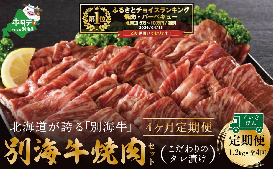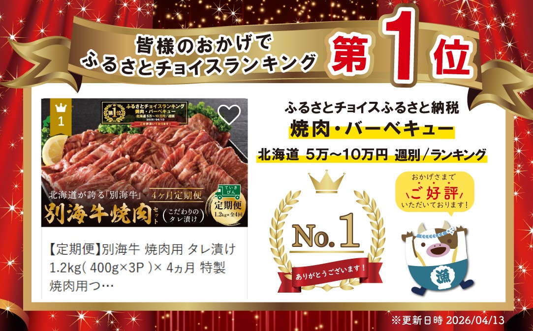 チョイスPayポイントと交換できる品 手間要らずの小分け!味付き!大満足の3パック1.2kgを4回定期便でお届け! 御礼!ランキング第1位獲得!【定期便】別海牛 焼肉用 タレ漬け 1.2kg( 400g×3P )× 4ヵ月 特製 焼肉用つけだれつき【全4回】【北海道 別海町産】【be010-0282-100-4】(肉 牛肉 焼肉 北海道 別海町 定期便 4 ふるさとチョイス ふるさと納税 仕組み キャンペーン 限度額 計算 ランキング やり方 シミュレーション チョイス チョイスマイル 肉 牛肉 定期便 )