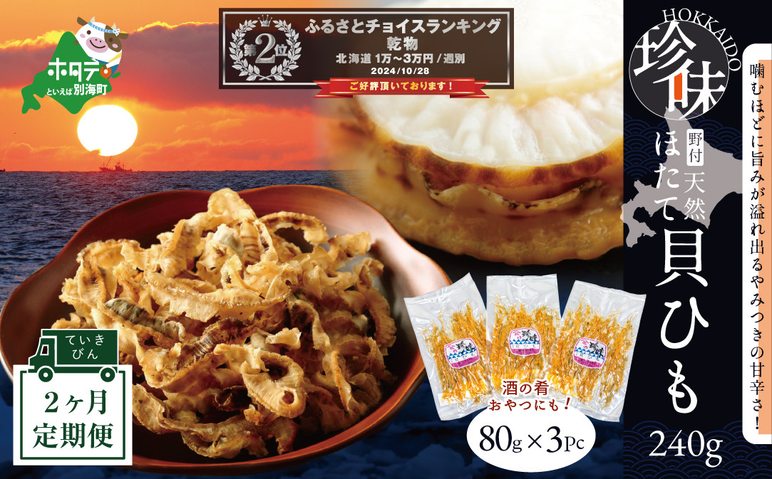 チョイスPayポイントと交換できる品 北海道野付産の天然ホタテの耳を加工した貝ひも珍味!噛めば噛むほど旨みが溢れます♪ ランキング第2位獲得!【定期便】野付産ホタテの耳を加工した貝ひも珍味 (80g×3pc)×2(ホタテ ほたて 帆立 海産物 貝ひも ひも 珍味 おつまみ ふるさとチョイス ふるさと納税 仕組み キャンペーン 限度額 計算 ランキング やり方 シミュレーション チョイス チョイスマイル 定期便 海鮮 )