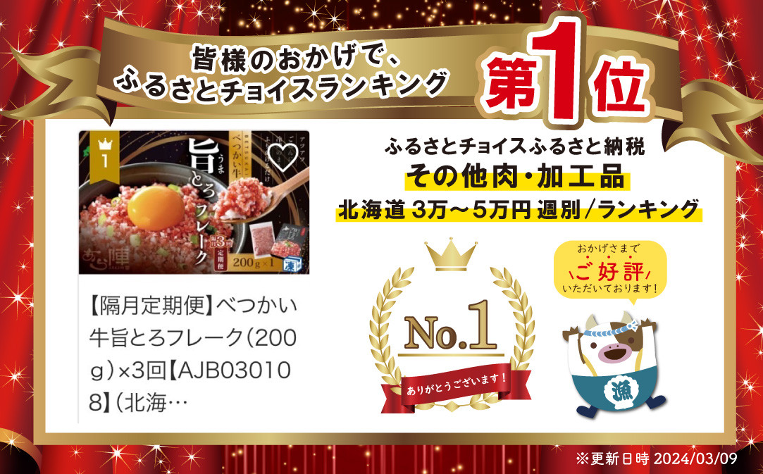 チョイスPayポイントと交換できる品 肉汁とろける魅惑のべつかい牛フレーク! 御礼!ランキング第1位獲得!【隔月定期便】べつかい牛旨とろフレーク(200g)×3回【AJB030108】(北海道 別海 肉 牛 フレーク ふるさと納税 ふるさとチョイス ふるさと納税 仕組み キャンペーン 限度額 計算 ランキング やり方 シミュレーション チョイス チョイスマイル 肉 牛肉 定期便 )