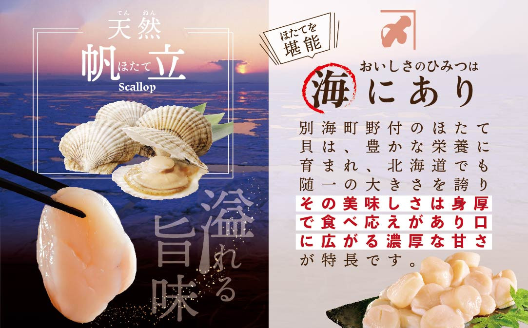 別海町野付のほたては、豊かな栄養に育まれ、北海道でも随一の大きさを誇ります。