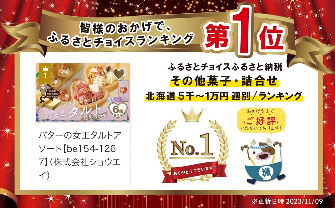 チョイスPayポイントと交換できる品 御礼!ランキング第1位獲得!北海道 別海町産 生乳 使用 バター の女王 タルト アソート 6個入り【SE0000008】(ふるさと納税 お菓子 ふるさと納税 クッキー バター プチギフト ふるさとチョイス ふるさと納税 仕組み キャンペーン 限度額 計算 ランキング やり方 シミュレーション チョイスマイル)