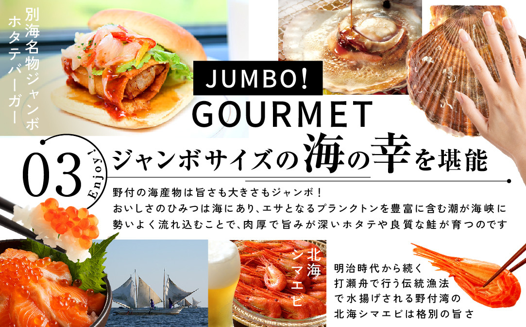 別海町の野付で獲れる海産物は大きさがジャンボ。魚介類の餌となるプランクトンを豊富に含む海流が流れ込み肉厚で旨味が深いホタテやアサリ、良質な鮭が育ちます。明治時代から続く打瀬舟で行う伝統漁方で水揚げされる野付湾の北海シマエビは希少性があり格別の美味しさです。