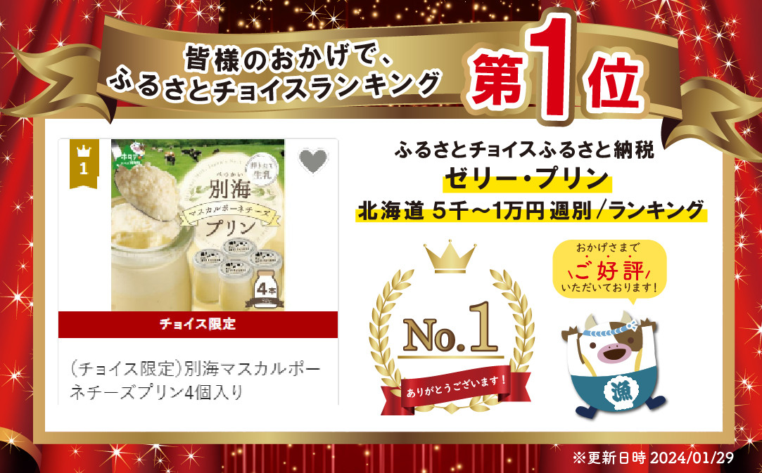 チョイス限定 チョイスPayポイントと交換できる品 三層構造が織りなす濃厚で深みのある、牛乳をたっぷり使ったプリンです! 御礼!ランキング第1位獲得!(チョイス限定)別海マスカルポーネチーズプリン4個入り( ふるさと納税 プリン 北海道 ふるさと納税 スイーツ 北海道 ふるさと プリン 北海道 ふるさと納税 )