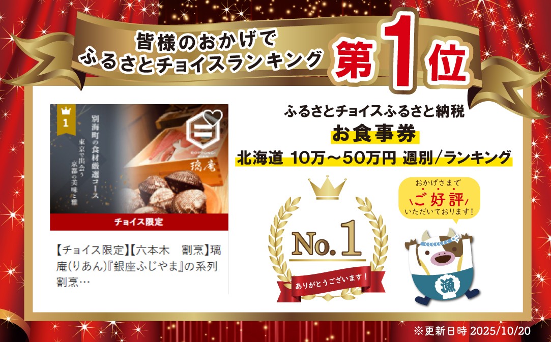 チョイス限定 チョイスPayポイントと交換できる品 【チョイス限定】御礼!ランキング第1位獲得!【六本木 割烹】璃庵(りあん)『銀座ふじやま』の系列割烹店「別海町の食材厳選コース」食事券1名様分 ※2名以上で利用可【CC0000233】 ( ふるさと納税 レストラン ディナー コース料理 ふるさと納税 食事 ふるさと納税 食事券 東京 ふるさと 食事券 ふるさと 食事 ふるさと 食事券 東京 ふるさと納税 東京 食事券 ふるさと納税 チケット )