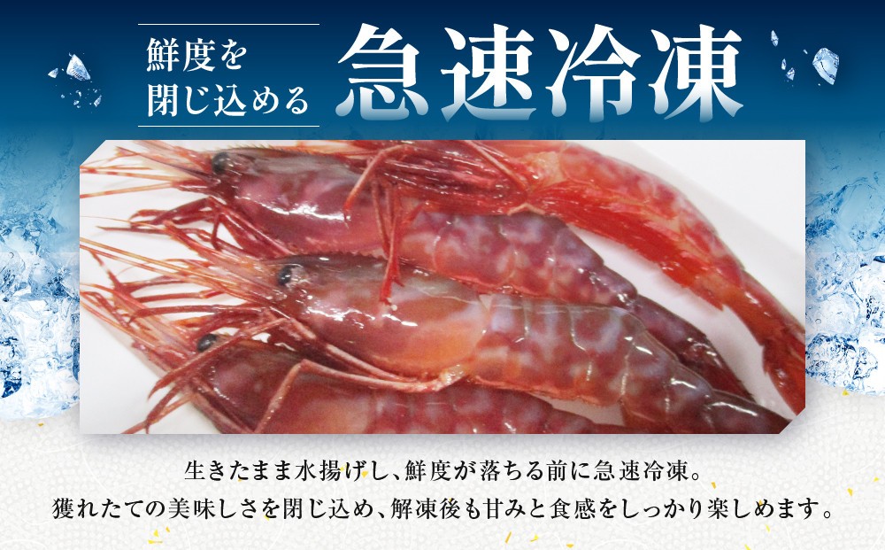羅臼で水揚げされたボタンエビを急速冷凍しました。お刺身、天ぷら、焼きエビなどお好みの調理でお召し上がりください。 <原産地>羅臼町