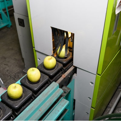 収穫したてのりんごを、1玉ずつ光センサーで褐変・糖度測定し糖度12度以上のりんごを選んで皆様にお届けします。