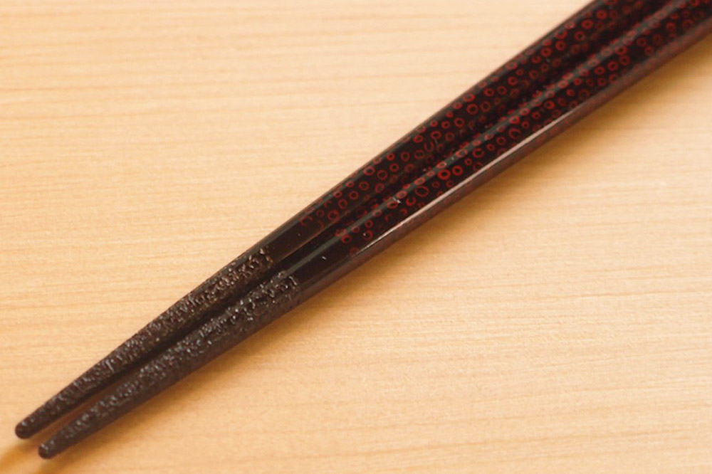 箸先が太くなったり、荒くなり過ぎたりしがちな漆での【すべらない箸先加工】を、機能性(掴みやすさ・舌触りなど)・デザイン性の両面から研究を重ね独自技術を開発致しました。