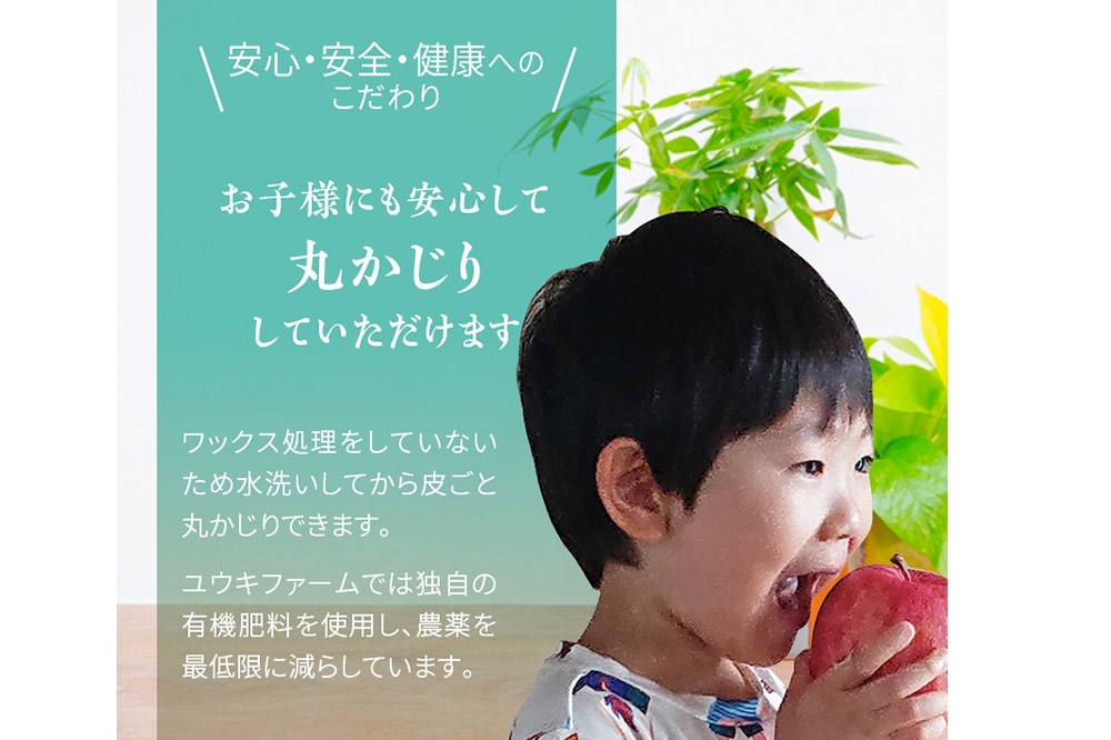 独自のオリジナル有機肥料を使用し、栽培期間中、農薬を通常の規定の2割ほど減らして栽培した、鮮度抜群でジューシーな味わいの葉取らずりんごをお届けいたします。ぜひご賞味ください。