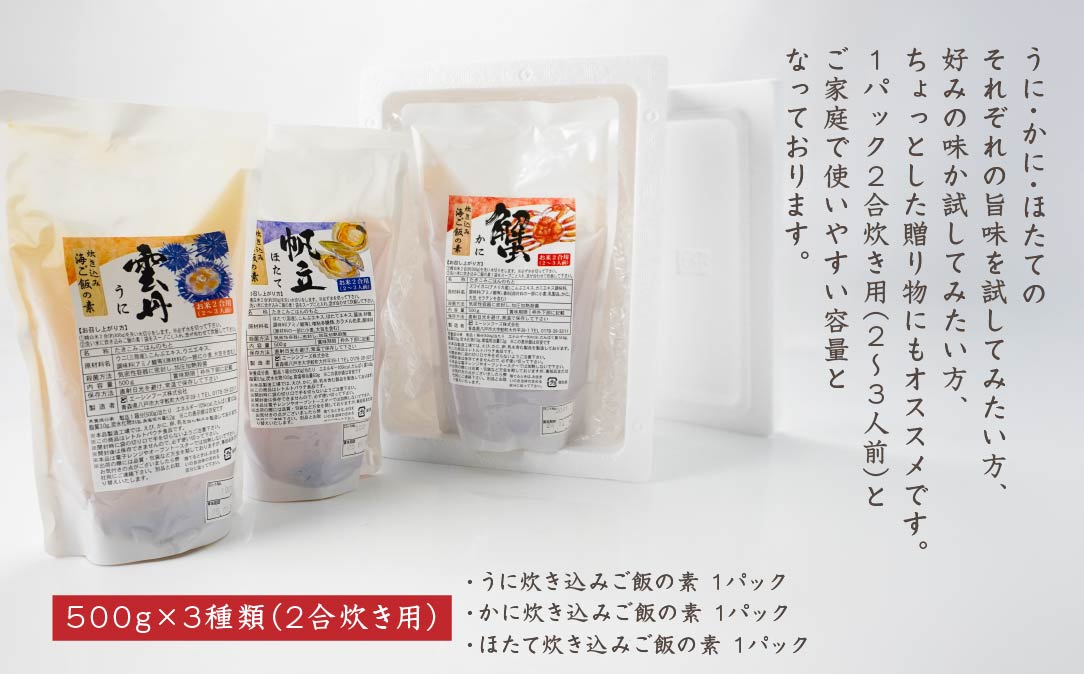味・原料にこだわった炊き込みご飯の素3種が楽しめるセットになっています! 炊き込みご飯の素 3種 セット 炊き込みご飯 うに ウニ ほたて ホタテ かに カニ 500g×各1パック