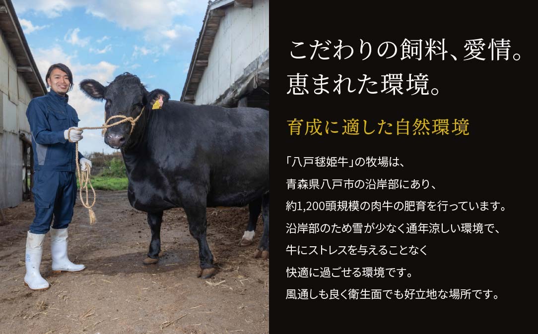 「八戸毬姫牛」は雌の交雑牛のみで当社オリジナルの飼料を与えており、ストレスの少ない環境で愛情を込めて飼育しています。