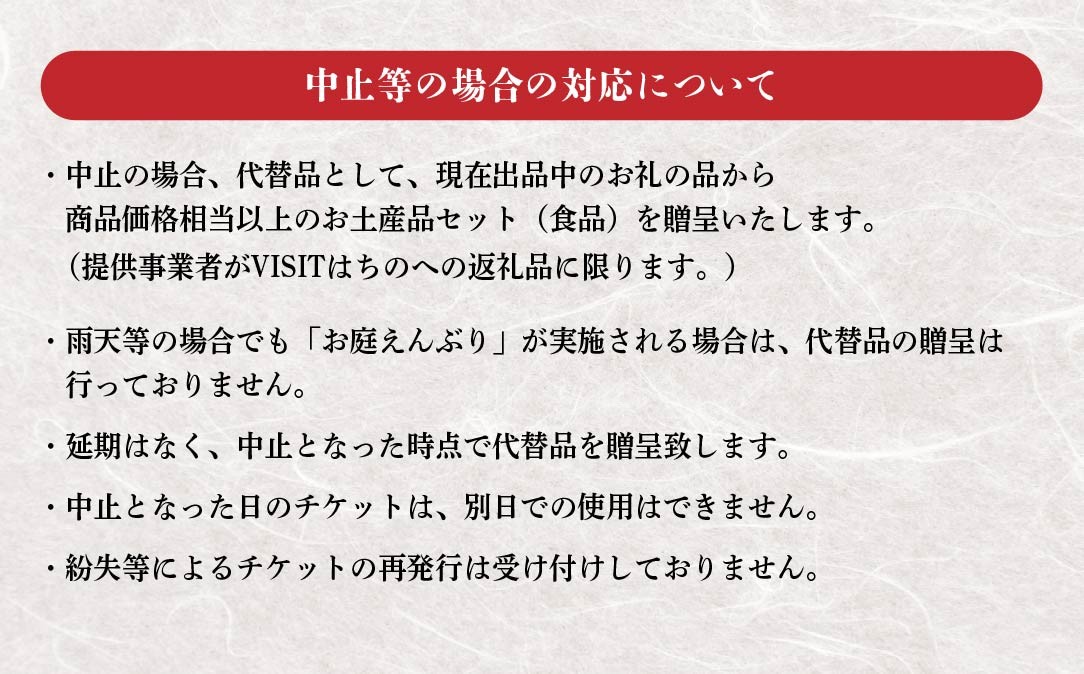 ・中止の場合、代替品として、現在出品中のお礼の品から商品価格相当以上のお土産品セット(食品)を贈呈いたします。(提供事業者がVISITはちのへの返礼品に限ります。)