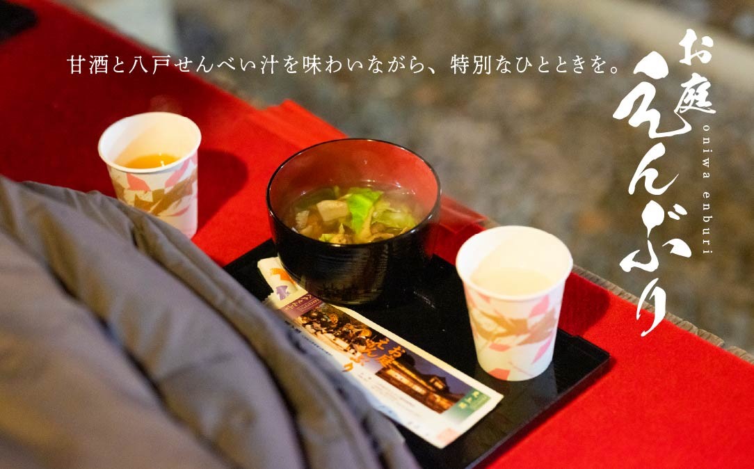 甘酒と八戸せんべい汁を味わいながら、お屋敷のだんな様気分でえんぶりを鑑賞する贅沢なひとときを過ごすことができます。