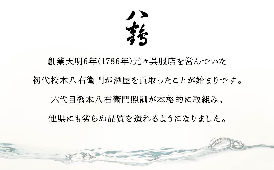 創業天明6年(1786年)元々呉服店を営んでいた初代橋本八右衛門が酒屋を買取ったことが始まりです。六代目橋本八右衛門照訓が本格的に取組み、他県にも劣らぬ品質を造れるようになりました。