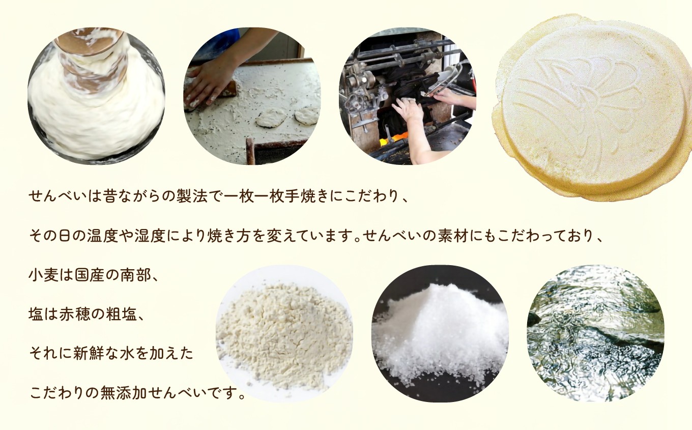 せんべいは、昔ながらの製法を守り、一枚一枚丁寧に手焼きしています。その日の温度や湿度に合わせて焼き加減を微調整するのは、まさに長年の経験が成せる技。なかでも「おつゆせんべい」は、あえて機械化に頼らず、職人の勘を頼りにその日の水加減を調整しています。人の手だからこそ生み出せる、素朴で奥深い味わいをお楽しみください。