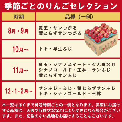 目安までに、サンつがる、黄王、シナノスイート、シナノゴールド、サンふじ、葉とらずサンふじ、ぐんま名月等をお届け予定です。収穫状況によってはこの限りではございませんので予めご了承くださいませ。