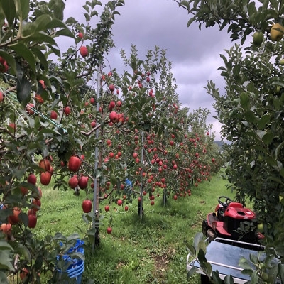 青森県は南八甲田の麓に位置する当園は、冬は雪深くりんご栽培も大変ですが、その豊富な雪解け水と、昼夜の寒暖差で、実がギュッとしまった美味しいりんごが獲れる地域です。
