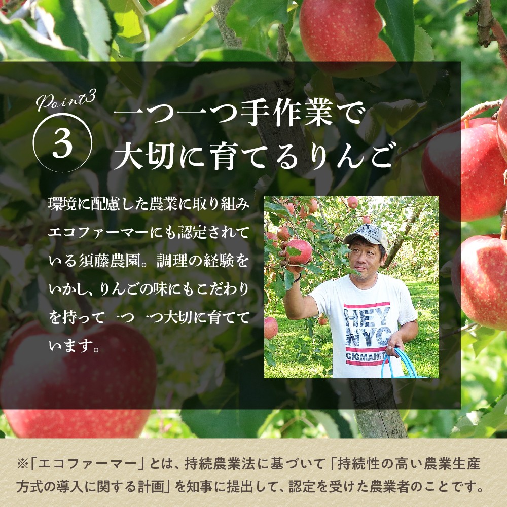 エコファーマー認証の特別栽培に準じた化学肥料を使わず、土づくりからこだわったふかふかの土の農園から生み出される須藤農園自慢のりんごです。