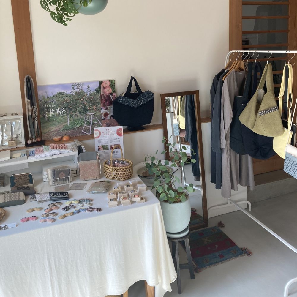アトリエ内には、作品販売やこぎん刺しの展示もあります。
