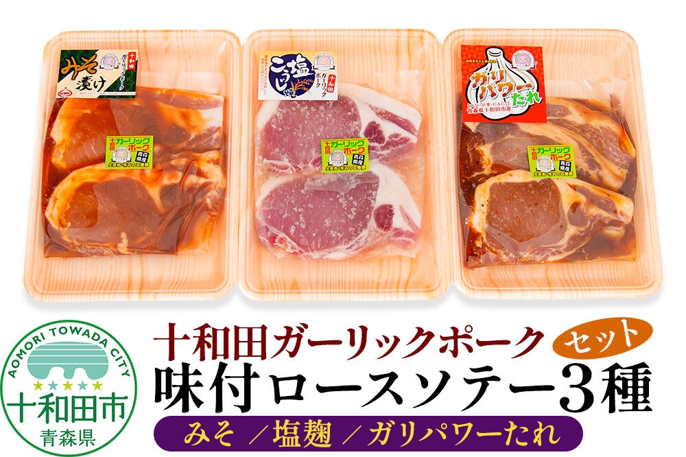 にんにくを食べて育った十和田ガーリックポーク。良質な豚肉と脂の甘さ。 十和田ガーリックポーク 味付ロースソテー3種セット(みそ、塩麹、ガリパワーたれ)2枚入×1パック 青森県十和田市産 [豚肉 国産 冷蔵 焼肉]