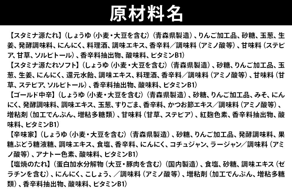 | 消費期限 | 賞味期限:・スタミナ源たれ:製造日から540日 ・スタミナ源たれソフト:製造日から540日 ・ゴールド中辛:製造日から540日 ・辛味家:製造日から540日 ・塩焼のたれ:製造日から360日 |