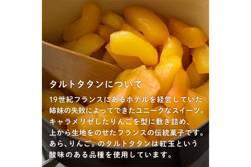 あら、りんご。のタルトタタンは時間をかけてゆっくりとりんごをキャラメリゼしています。ひとつひとつ手作りで、手間暇かけるからこそ、りんご本来の酸味や甘さを感じられる上品な風味のタルトタタンです。
