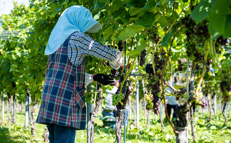 ぶどうの収穫は、毎年9月中旬から約1ヶ月間行われます。お手伝いをしてくれる地域住民の協力を得ながら、10~15名ほどで広大な土地に育つぶどうを収穫していきます。
