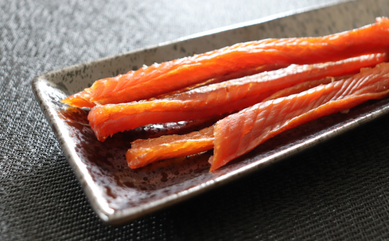 山口養魚場の渓流サーモンで作った、旨みの凝縮された燻製ジャーキーです。