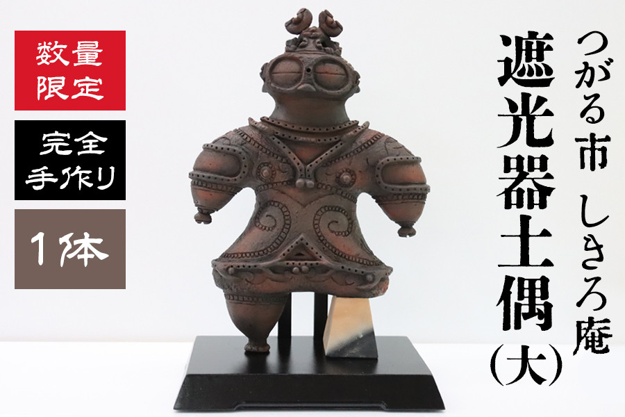 ★★数量限定★★ 世界文化遺産登録となった、つがる市亀ヶ岡遺跡から出土した、遮光器土偶をかたどった像です。 この「遮光器土偶の置物(大)」は、出土した現物のほぼ原寸大の大きさです。 片足がなく、きわめて奇妙な顔形をしており、眼鏡のようなものが北方民族のイヌイットが雪中の光除けに着用した「遮光器」に似ていることから、「遮光器土偶」と呼ばれています。 昭和32年に国の重要文化財にも指定されており、現在は東京国立博物館に保管されています。 遮光器土偶は「しゃこちゃん」の愛称で親しまれており、市の駅舎やマンホール、まちの掲示板などに広く使用されています。 《完全手作り》 陶芸家による完全手作りとなるため、この世に一体として同じものはございません。 画像とは形や焼き色などが多少異なることをご了承ください。 本物の遮光器土偶が出土した亀ヶ岡地区の土を使用しており、より本物の遮光器土偶に近い土偶と言えます。 ガラスケースに入れて飾るとほこりを防げるのはもとより、東京国立博物館で飾られている本物の遮光器土偶のように見えるのでおすすめです。 【注意事項】 ※写真のガラスケースは返礼品に含まれません。 ※割れ物ですので取扱いには十分ご注意ください。 ※お申込の際、ご希望であれば両足をつけて作成することも可能です。 ※寄付者様の都合による再送・返品はできかねますので、ご理解の上お申し込みください。 ※万が一、届いた返礼品に破損などがあった場合は、必ず画像撮影の上、破棄される前にご連絡ください。 ※画像はイメージです。 【しきろ庵】
