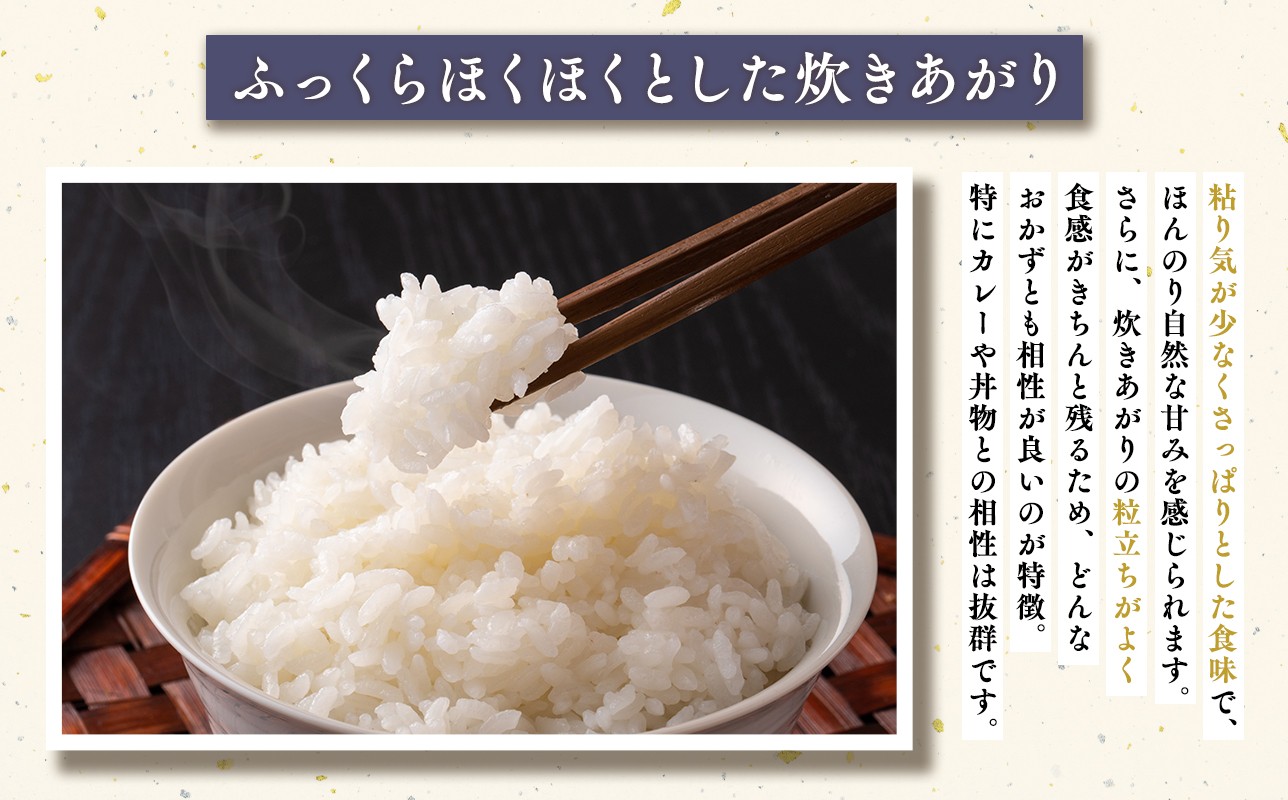 食味・品質の追及にとことんこだわって誕生した「まっしぐら」。いもち病に強く、収量性に優れた品種で、粒ぞろい・米張りなどの外観の良さも特徴の品種です。炊き上がりの粒立ちがよく食感がきちんと残るため、どんなおかずとも相性が良いのが特徴です。特にカレーや丼物との相性は抜群です。