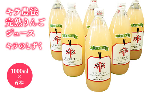 【完熟りんごジュース「キラのしずく」1L×6本 (細口ボトル)】 おいしさを極めた、こだわりの完熟りんごジュース「キラのしずく」 低温で仕上げた生絞りのような濃厚な味わいのりんごジュースをお届けします。 是非ともご賞味ください。 【キラ農法とは?】 栽培期間中、化学肥料、ホルモン製剤、遺伝子操作を使わずに植物が持っている潜在能力を最大限に生かす農法です。 十分に醗酵した完全堆肥で、植物自体を強くする農法で「人にやさしく!」「環境にやさしく!」「地球にもやさしく!」安心、安全!な日本一のおいしいりんごを目指しています!!青森県りんご品評会で数多くの受賞歴があるこだわりのりんごを使用したりんごジュースです。 【注意事項】 ※画像はイメージです。 ※受取後、すぐに返礼品の状態をご確認ください。 ※万が一、不良品の場合は現状をご確認させて頂き、現品と交換の対応をさせて頂きますので、ふるさと納税サポートセンターまでご連絡ください。(お時間が過ぎてからの交換は致しかねます。) ※ご不在等により、返礼品を受け取れなかった場合の再出荷は致しかねます。 ※寄附者情報、配送先情報を正しくご入力ください。配送先情報欄以外に配送先情報を記載された場合、対応致しかねますのでご了承ください。 ■関連ワード:果汁100%、りんごジュース、キラ農法、平川市、ギフト