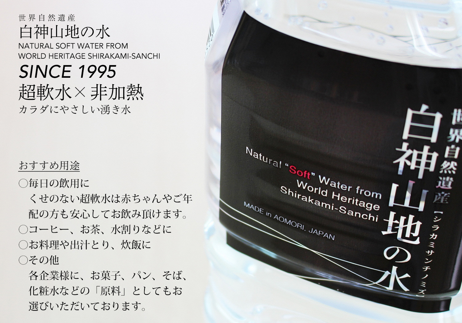 日本初の世界自然遺産白神山地で育まれた湧き水を、非加熱製法にてボトリング。水に含まれる酸素や二酸化炭素は自然のまま。硬度はわずか0.2mg/lの「超」が付くほどの軟水で、やわらかく、まろやかな口当たりが好評です。コーヒー、お茶、お料理にも最適。赤ちゃんも安心して飲める、体に優しい湧き水です。