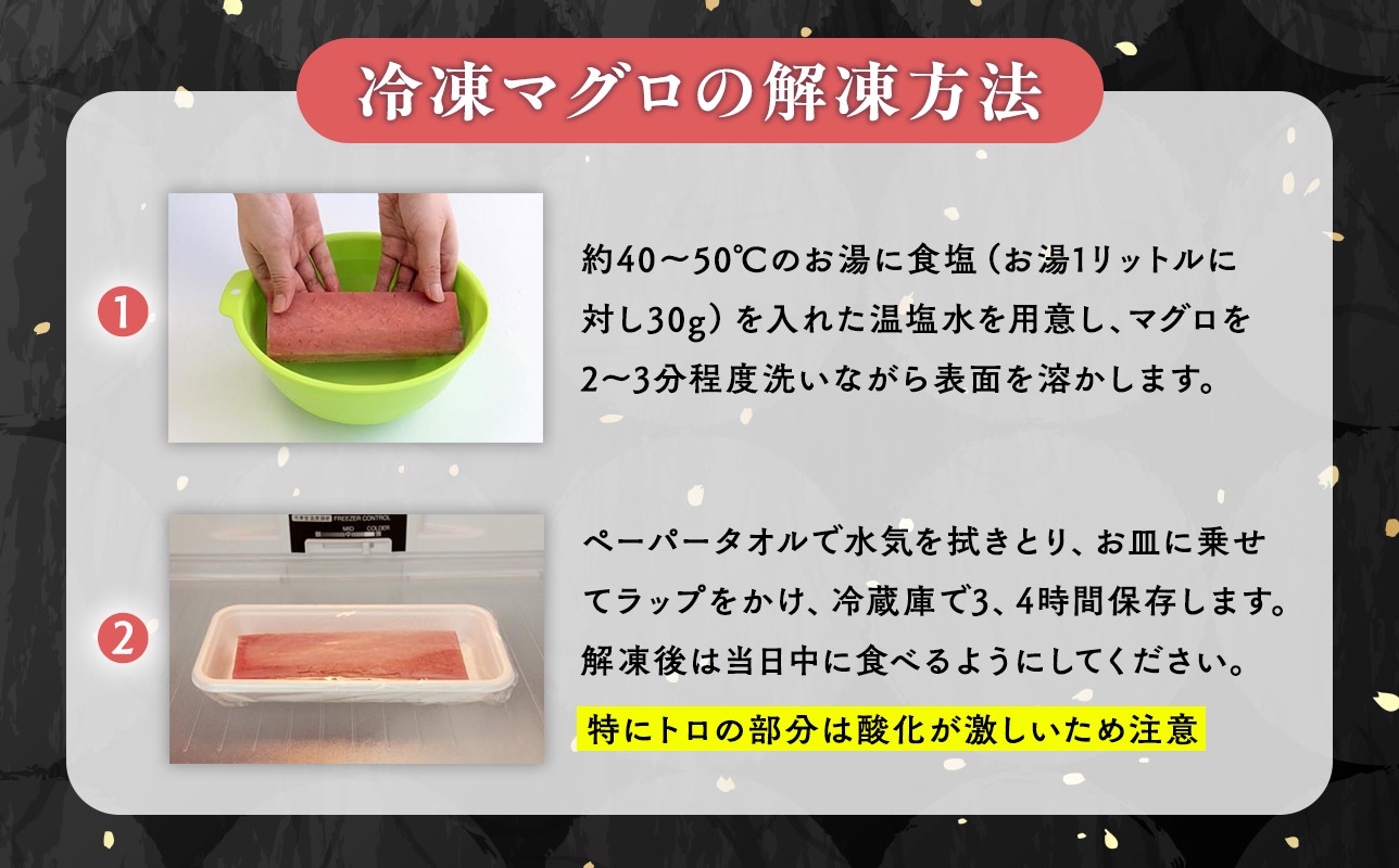 | 容量 | 深浦産天然本マグロ赤身200g×1サク 深浦産天然本マグロ大トロ150g×1サク 青森サーモンのサク100g×4パック |