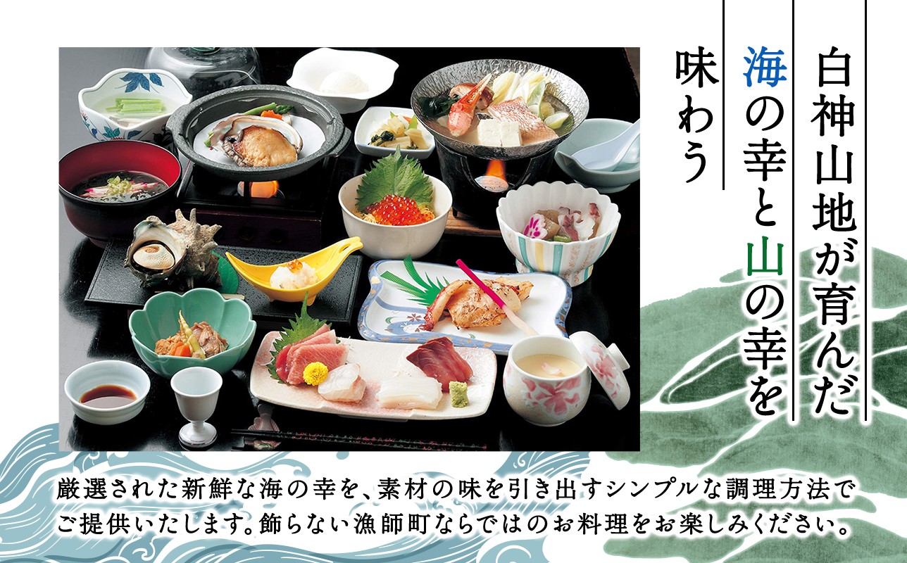 料理は前浜の新鮮魚介や白神の山の幸など、旬の恵みを素材そのままに味わえます。