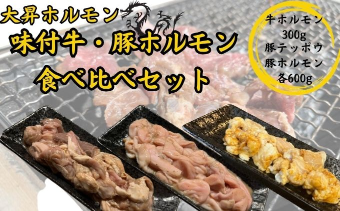 【創業1983年、板柳の名店・大昇ホルモンの味付け牛・豚ホルモン食べ比べセット計1.5kg】【豚テッポウ600g/豚ホルモン600g/牛ホルモン300g】