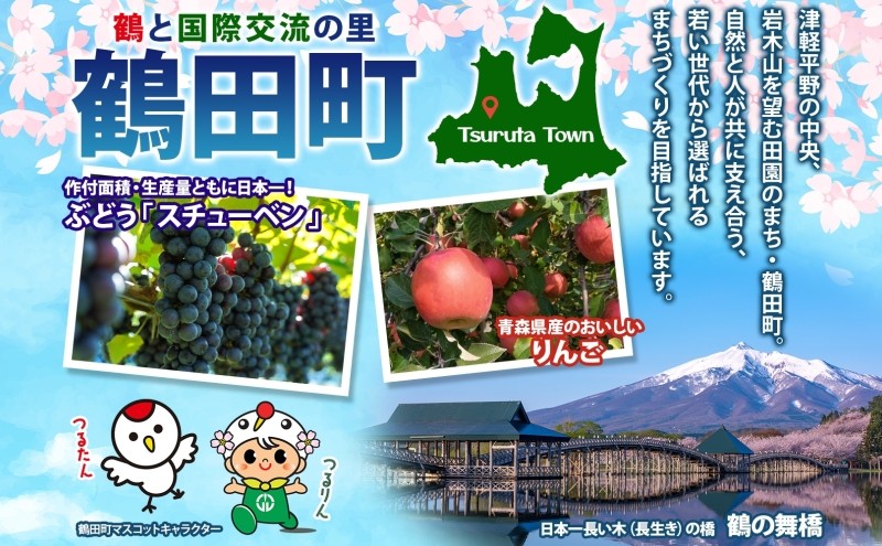鶴田町は、津軽平野のほぼ中央に位置し、南西に秀峰岩木山を望み、町の中央を岩木川が流れる郷愁を誘う田園風景が広がっています。この恵まれた自然環境を活かし、稲作とりんご栽培を中心とした農業を主産業に歩んできました。昭和40年代から転作作物として導入されたブドウ「スチューベン」が作付面積、生産量ともに日本一を誇るほどになり、町を代表する特産品となっています。