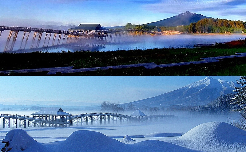 岩木山の雄大な山影を背に、津軽富士見湖に美しい姿を映す全長300m、三連太鼓橋では日本一長い木橋である『鶴の舞橋』の・・・四季