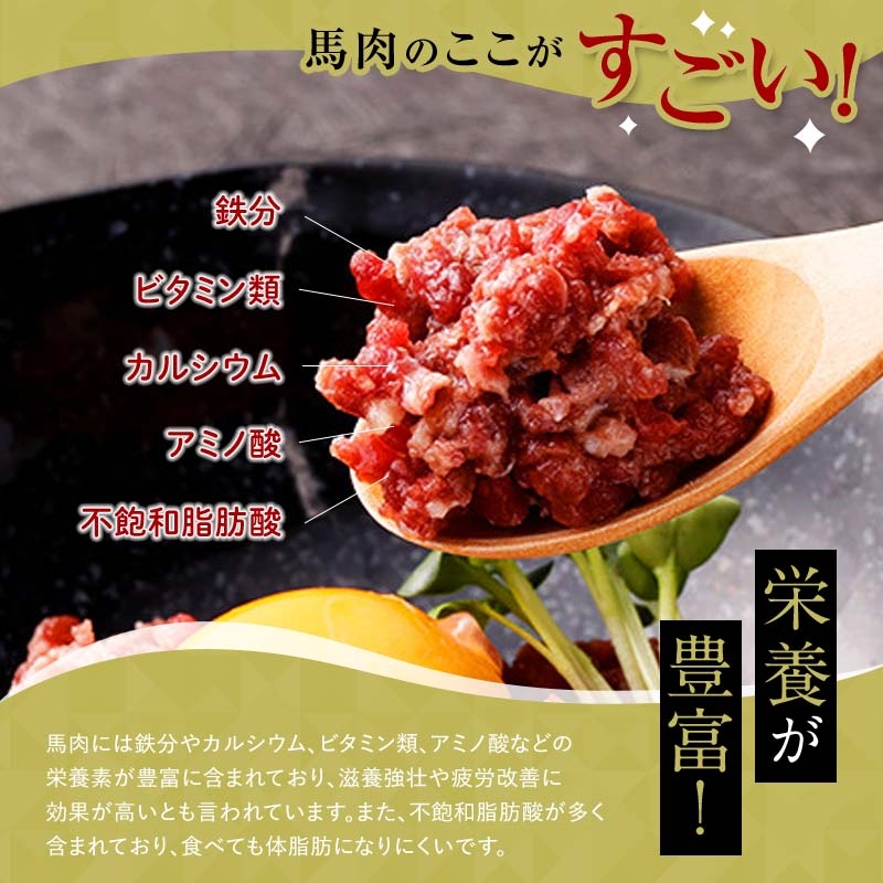 ・ユッケ:解凍して付属のタレを絡めるだけでお召し上がりいただけます。新鮮な馬肉だからこそ生でも安心して楽しめ、卵黄や刻みネギ、ゴマなどをのせるとさらに味わいが豊かになります。