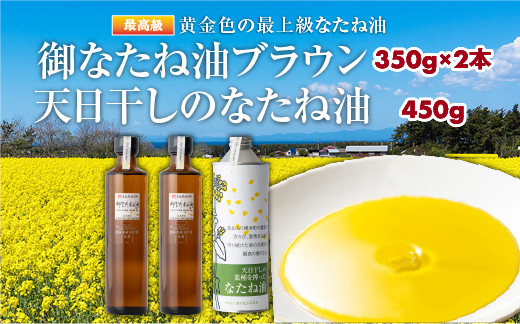 | 容量 | 御なたね油ブラウン 350g×2 天日干しのなたね油 450g×1 |
