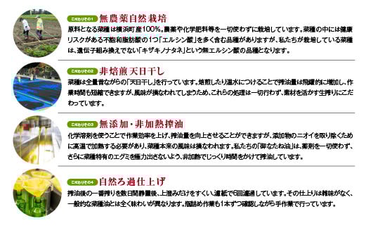 無農薬栽培の国産品種の菜の花から採れる菜種だけを使用しています。収穫した菜種を“天日干し”することにより風味を損なわず、素材本来の美味しさを引き出す“生絞り”にこだわっていいます。非加熱でゆっくり時間をかけて搾油し、さらに自然ろ過を繰り返すことで、雑味のないまさに一番搾りのピュアオイルが誕生します。天日干しした菜種は、1年を通して搾りたてを用意できるように保存され、販売機会に合わせて搾油することで常にフレッシュな搾りたてのなたね油を提供しています。