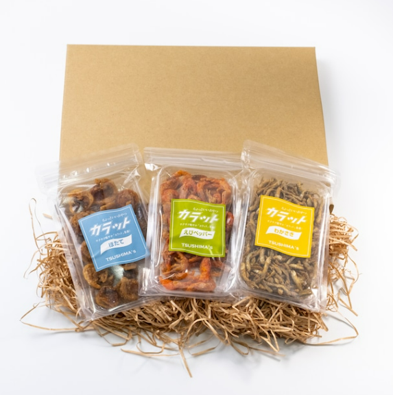 | 容量 | 【Tsushima's!!カラット3兄弟】 ・わかさぎカラット:40g×1 ・えびペッパー:20g×1 ・ほたてカラット:40g×1 |