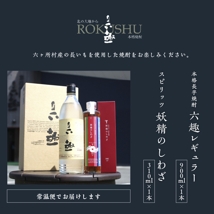 ■六趣醸造工房について 青森県は、日本一の長いもの産地です。 そしてタンパク質、ミネラルなどを豊富に含んでいます。 「自然豊かで栄養価の高い六ヶ所村産の長いもを原料とした焼酎を造りたい」との想いから、村では1991年(平成3年)九州の酒造会社に長いも焼酎の商品開発を依頼。 その結果、口当たりがよく濃厚な味わいの本格焼酎「六趣」が誕生しました。 村では増産体制の確立、農商業、観光振興面への効果なども視野に入れ、焼酎製造工場を2006年(平成18年)3月に完成。 「六趣醸造工房」と命名されました。 ■本格長芋焼酎 六趣 レギュラー 六ヶ所村の特産品である長いもを使用。 すっきりとしたライトな口当たりの中にも、原料である長いもの特徴を充分に堪能できる一品に仕上がっております。 ■スピリッツ 妖精のしわざ 六ヶ所村の特産品である長いもを使用した本格焼酎「六趣」の原酒に、「はまなす」のフレーバーを加えた逸品。 「はまなす」由来の香りと「六趣」とのマッチングを愉しめます。