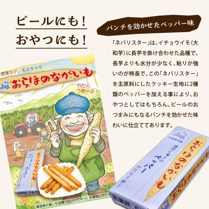 「おらほのながいも」<br> おらほ=私の町のというネーミングの通り、ご当地 六ケ所村の特産品である「ネバリスター」という長芋を生地に練り込んだスティック状のスナックです。<br> <br> 「ネバリスター」は、イチョウイモ(大和芋)に長芋を掛け合わせた品種で、長芋よりも水分が少なく、粘りが強いのが特長で、この「ネバリスター」を主原料にしたクッキー生地に2種類のペッパーを加える事により、おやつとしてはもちろん、ビールのおつまみにもなるパンチを効かせた味わいに仕立ててあります。<br> クッキー生地のサクッとした食感も大事にする為、焼きあがった直後から温度・湿度管理に拘り、丁寧に個包装いたしました。<br> <br> ■内容物<br> ・おらのほながいも 6本入り 4箱<br> <br> ※開封後はお早めにお召し上がり下さい。<br>