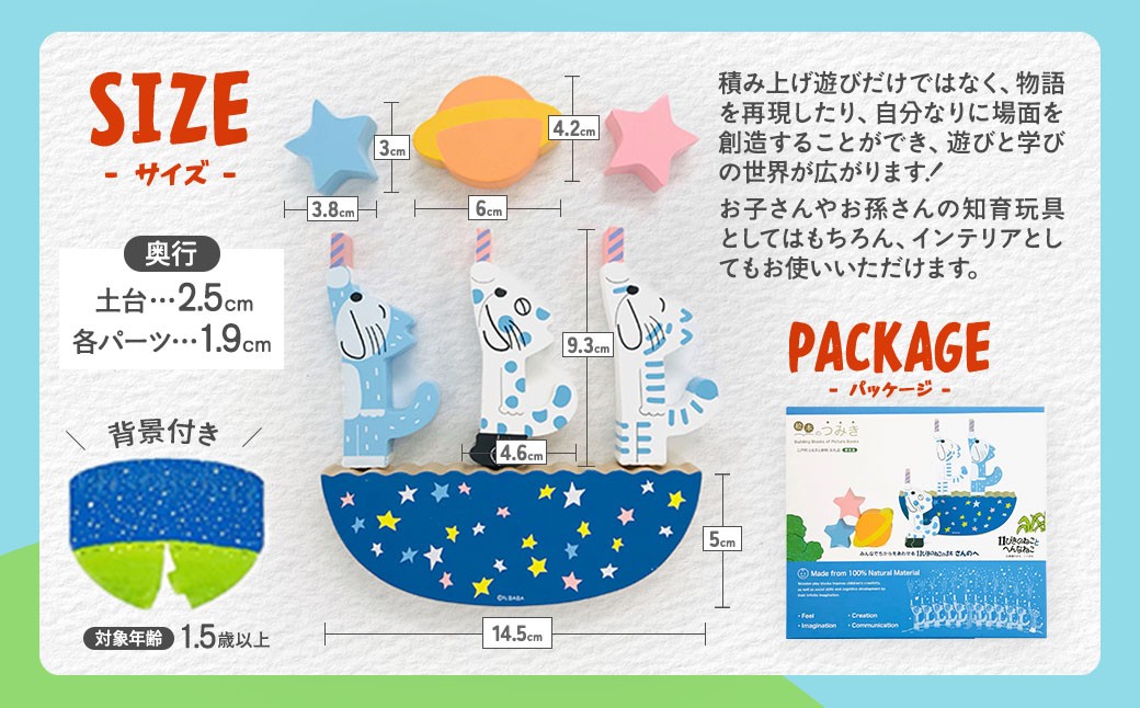 パッケージから素敵で、開ける前にしばらく眺めて楽しみました。積み木は手触りが優しくて、本当に絵本から飛び出したりみたいにいきいきしてて、これを選んでよかったなぁと思ってます。