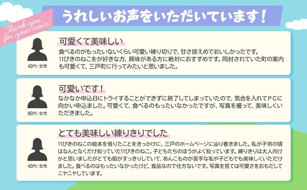 注文後すぐに届きました。以前から気になっていたので、段ボールを開ける瞬間からワクワクが止まりませんでした。包装まで11ぴきのねこ!!ねりきりは言うまでもなく可愛い!そして食べるのがもったいないけど…味も美味しい!また注文したいなと思います。