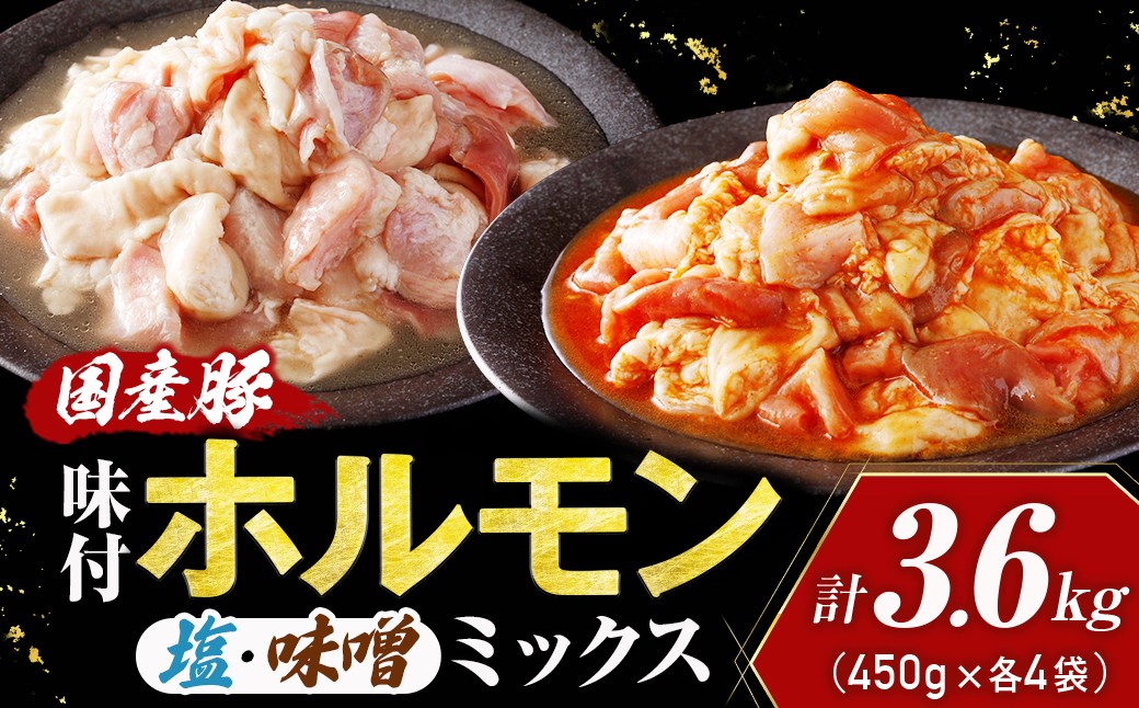 国産豚 味付ホルモンミックス【塩・味噌】セット 計3.6kg(450g×各4P) ホルモン 豚ホルモン 肉 国産 セット 焼肉 おつまみ お取り寄せ 味付き 惣菜 青森県三戸町 AT-25-009