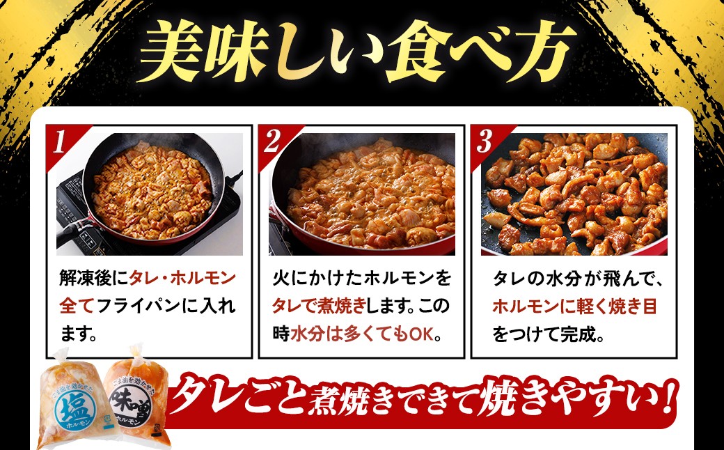冷蔵庫で解凍し、フライパン等にタレごとホルモンを全て入れ、中火で約10分~15分水気がなくなるまで、中心部まで十分に加熱して、焼目がついたら食べ頃です。