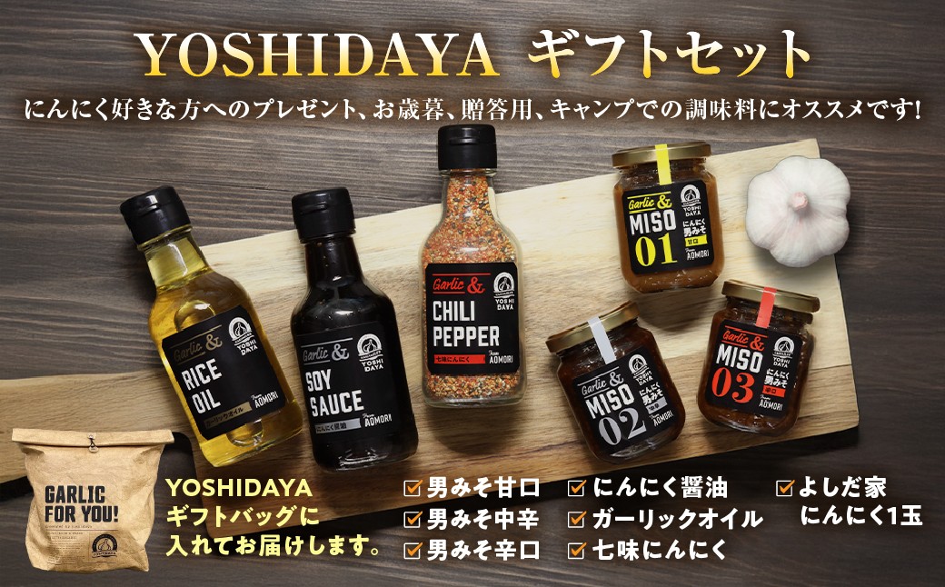 YOSHIDAYA Original Seasoningギフトセットです! YOSHIDAYAギフトセット(男みそ(甘口、中辛、辛口)(各100g)、にんにく醤油(170g)、ガーリックオイル(140g)、七味にんにく(75g)各1本、よしだ家にんにく1玉セット) にんにく ニンニク 大蒜 醤油 オイル 油 七味 調味料 香辛料 味噌 セット スタミナ 料理 青森県 三戸町 AB-25-025