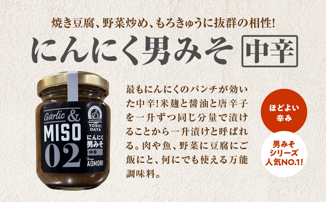 男みそ甘口、男みそ中辛、男みそ辛口、にんにく醤油、ガーリックオイル、