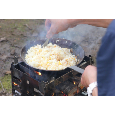 キャンプにおける様々な調理に対応した厚さ3.2mmの鉄フライパン。
