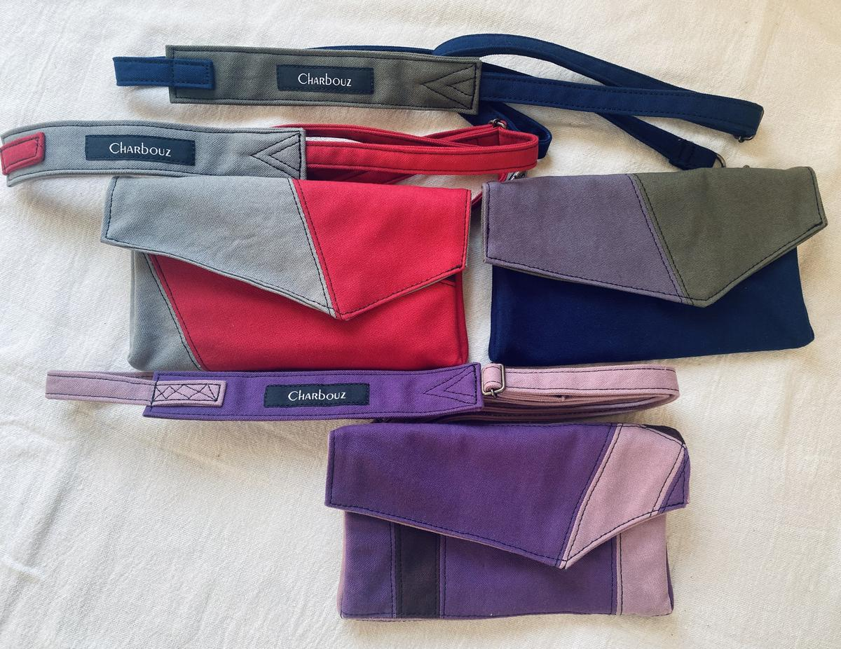 帆布3色でデザインし、縫製したスマートフォンだけを持ち歩くための横型ケースのショルダーバッグです。